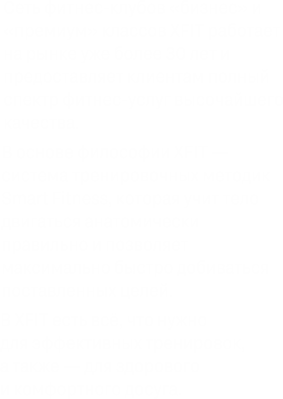 Сеть фитнес-клубов «бизнес» и «премиум» классов X-Fit работает на рынке уже более 30 лет и предоставляет клиентам полный спектр фитнес-услуг высочайшего качества. В основе философии X-Fit — система тренировочных методик Smart Fitness, которая учит тело двигаться анатомически правильно и позволяет максимально быстро добиваться поставленных целей. В X-Fit есть всё, что нужно для эффективных тренировок, а также — для здорового и комфортного досуга.